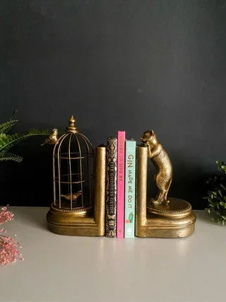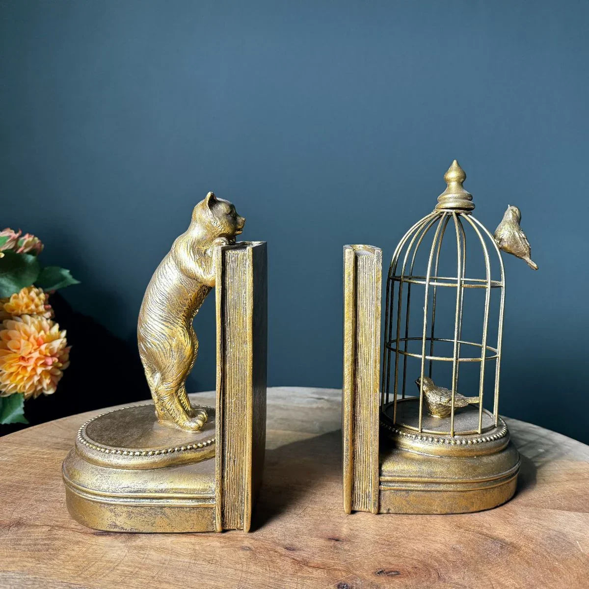 De ene boekensteun toont een nieuwsgierige kat, terwijl de andere is vormgegeven als een sierlijke vogelkooi met een vogel. Samen vormen ze een opvallend en kunstzinnig duo dat niet alleen functioneel is, maar ook dient als decoratief statement in je interieur.