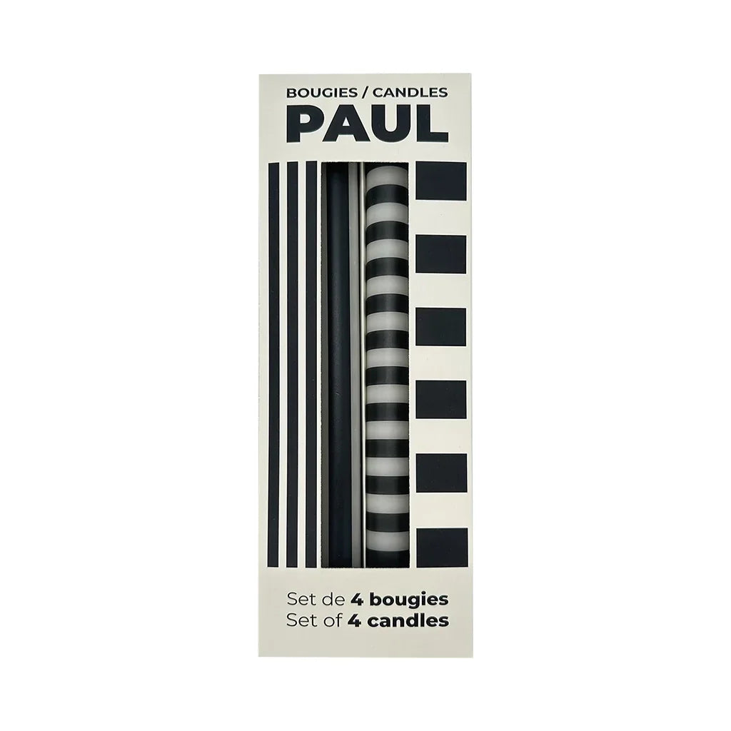 Deze set van 4 lange zwart-gestreepte kaarsen brengt direct karakter en contrast in je interieur. Het grafische streeppatroon zorgt voor een moderne, speelse uitstraling en maakt deze kaarsen tot echte sfeermakers op tafel, in een kandelaar of op een dressoir.
