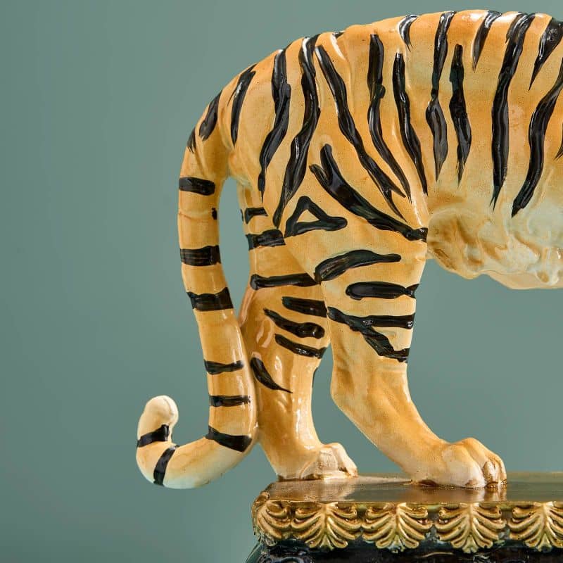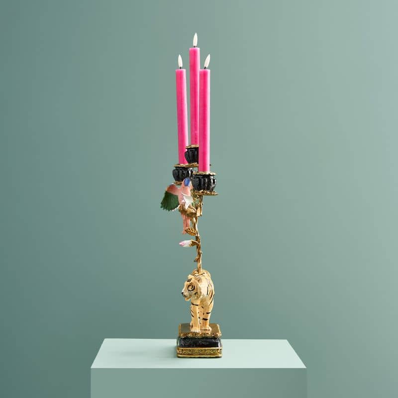 Deze indrukwekkende tijger kandelaar combineert kracht, elegantie en speelsheid in één uniek design. De handgeschilderde tijger vormt de basis van deze bijzondere kandelaar, aangevuld met sierlijke takken, bloemen en kleurrijke accenten zoals een exotische vogel.